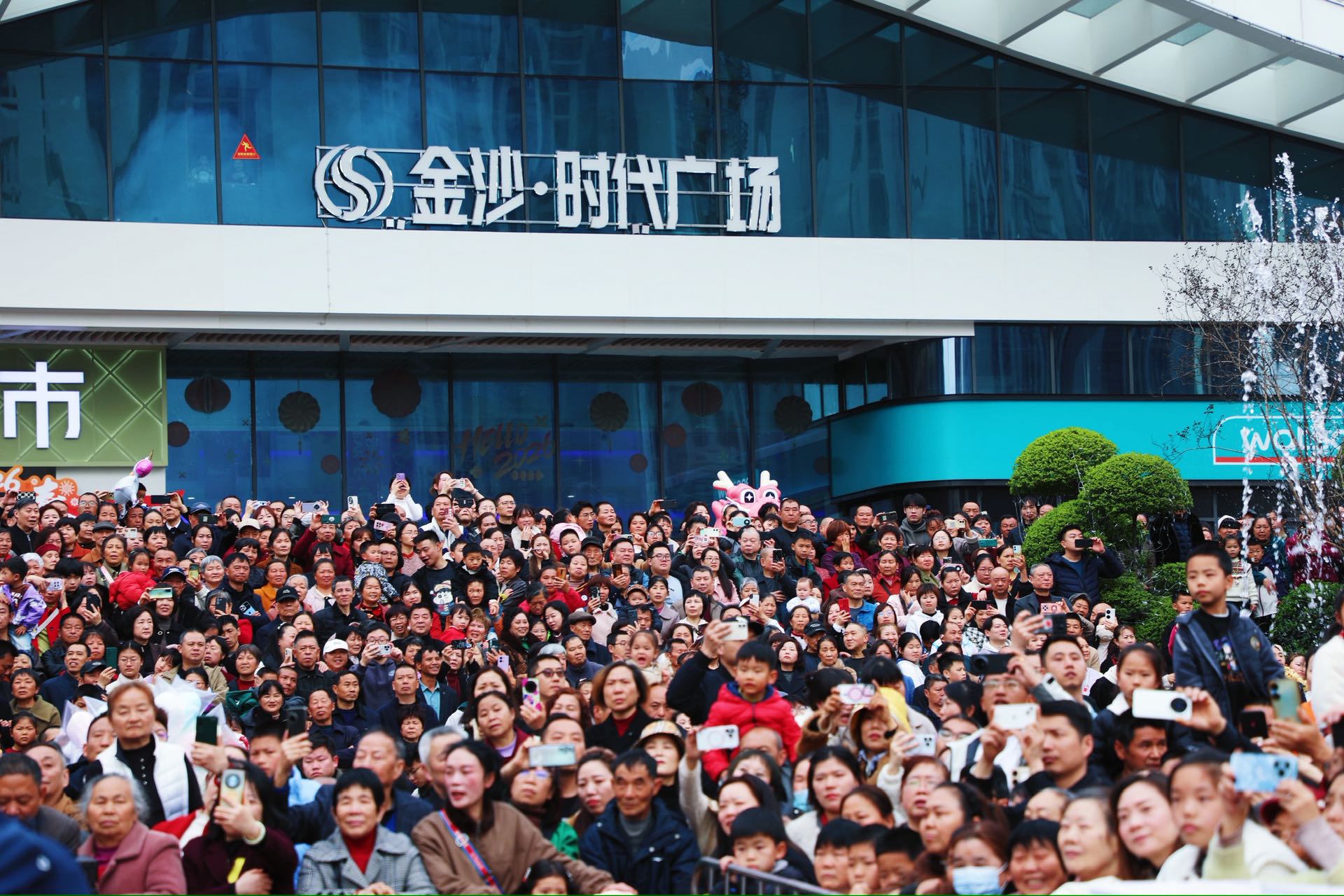 在金沙时代广场、新街里商业街区的“接龙台”,巡游队伍在此展开精彩的互动表演。民俗表演队载歌载舞,舞龙队围绕接龙台翻腾舞动,金龙穿梭、气势磅礴,现场锣鼓声、鞭炮声、欢笑声交织成一片,浓浓的年味扑面而来。