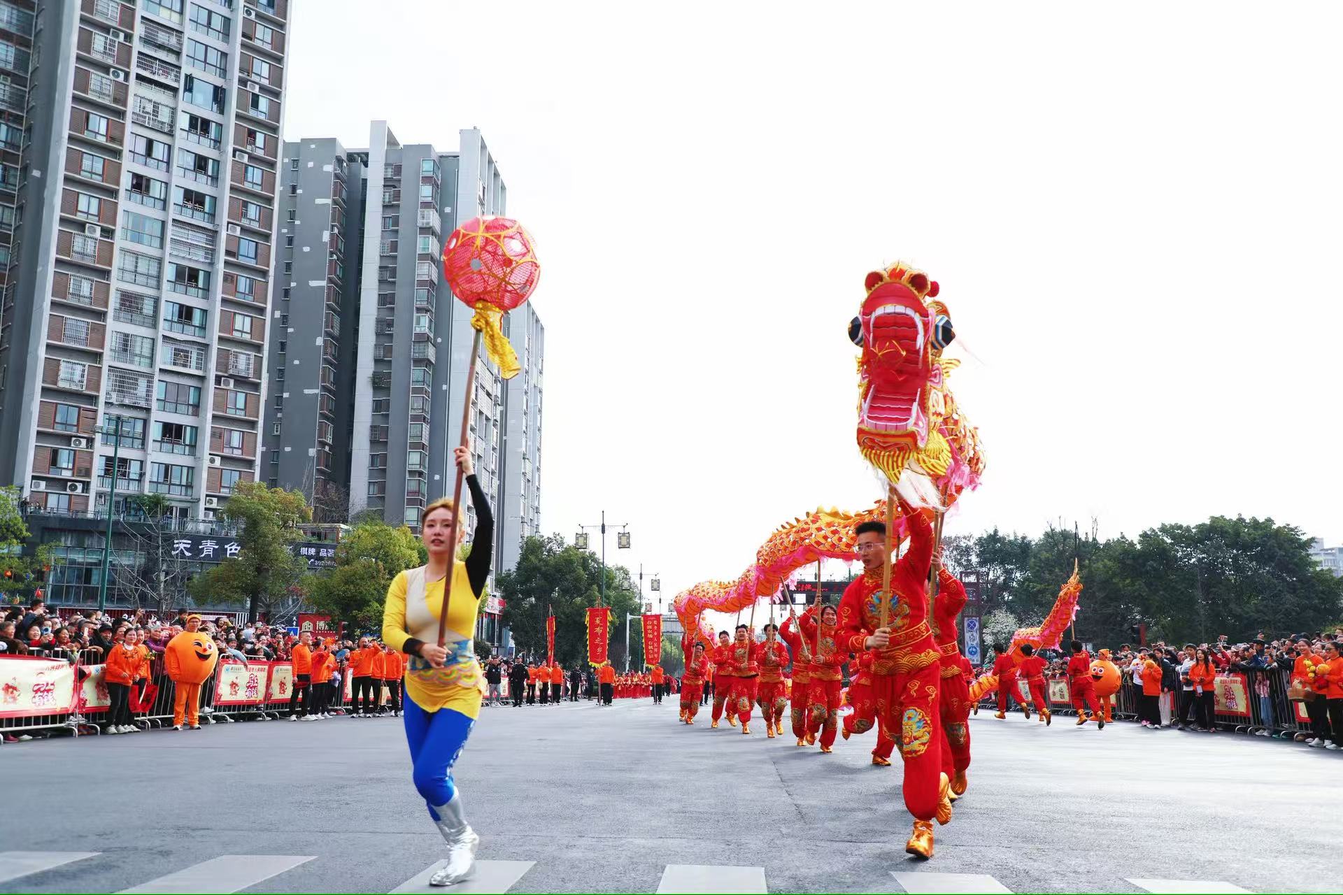 巡游方阵特色鲜明,由17个方阵组成。第一方阵为“三个隆昌”花车方阵,花车装饰精美、寓意深远,展现隆昌市城市发展的崭新风貌;紧随其后的是“隆昌风采”“稻田虾羊肉汤”特色方阵,巧妙融合地域风情与美食文化,尽显地方独特魅力;13个镇(街道)舞龙队依次巡游,金龙、彩龙精神抖擞、栩栩如生,舞龙队员们身着盛装,步伐整齐、动作矫健,时而盘旋飞舞、时而昂首腾跃,将舞龙技艺展现得淋漓尽致。