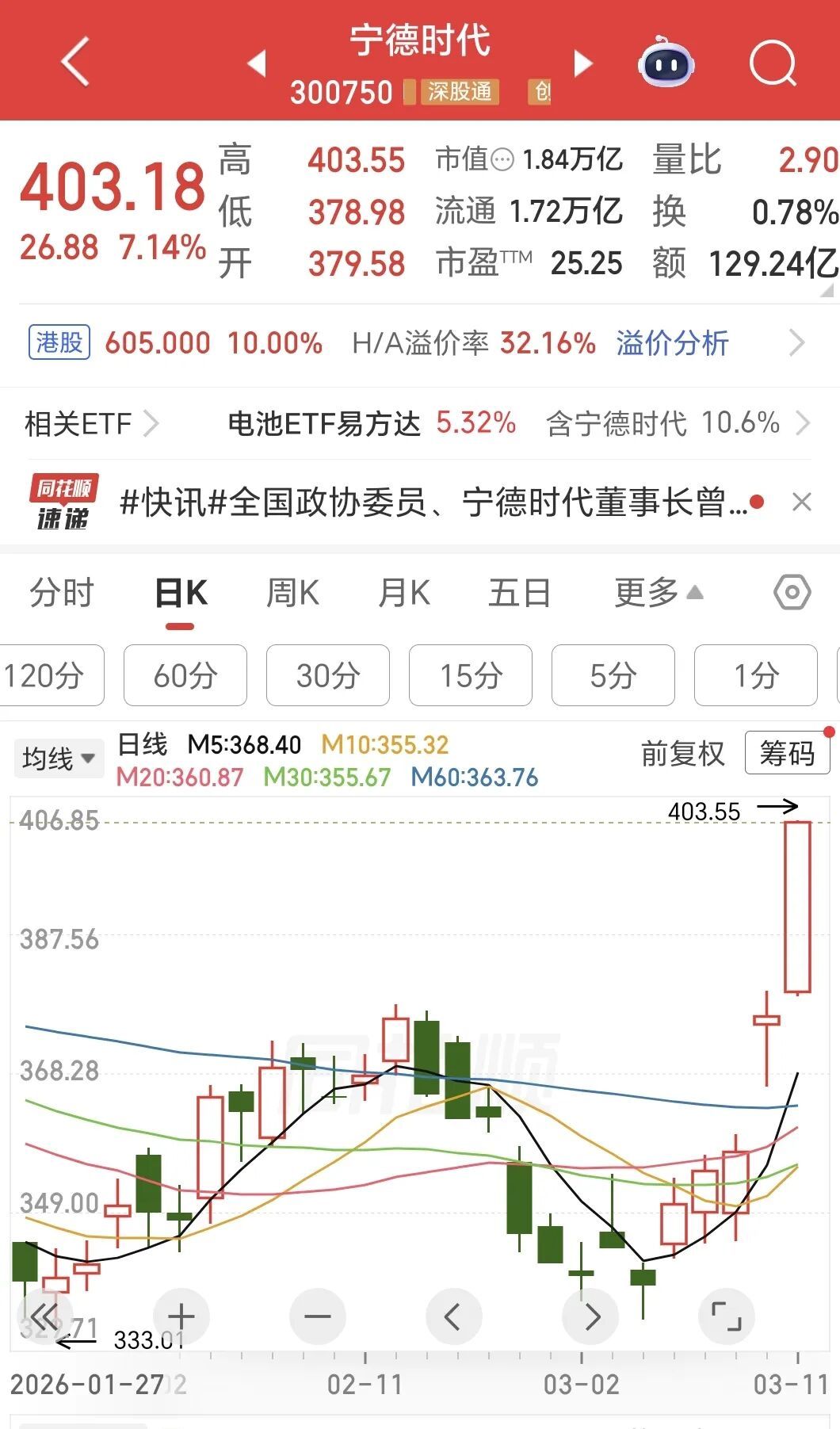 3月11日,宁德时代A股股价盘中大涨超7%,突破400元,总市值突破1.8万亿元。