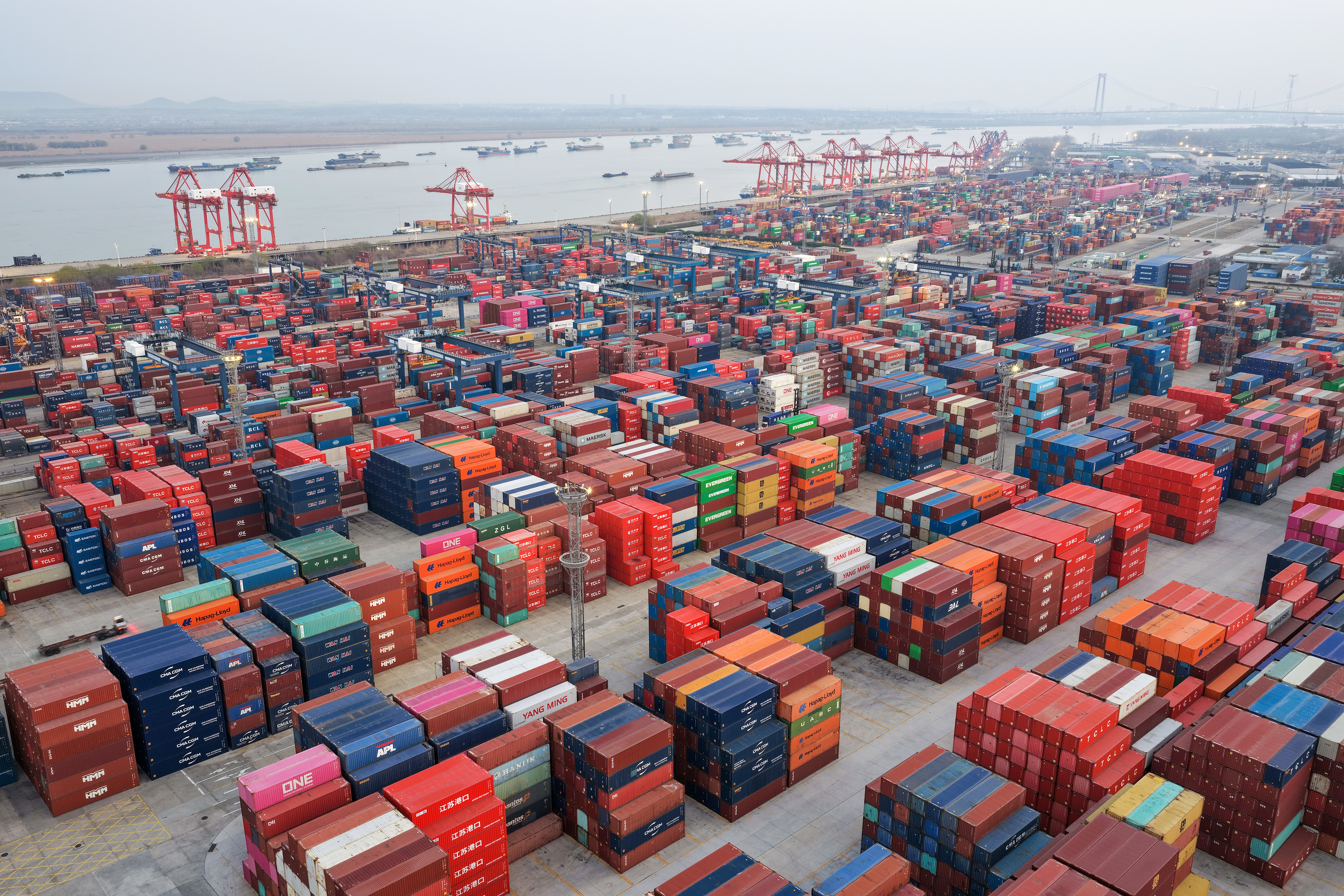 3月10日拍摄的江苏省港口集团南京港龙潭集装箱码头(无人机照片)。新华社发(方东旭摄)