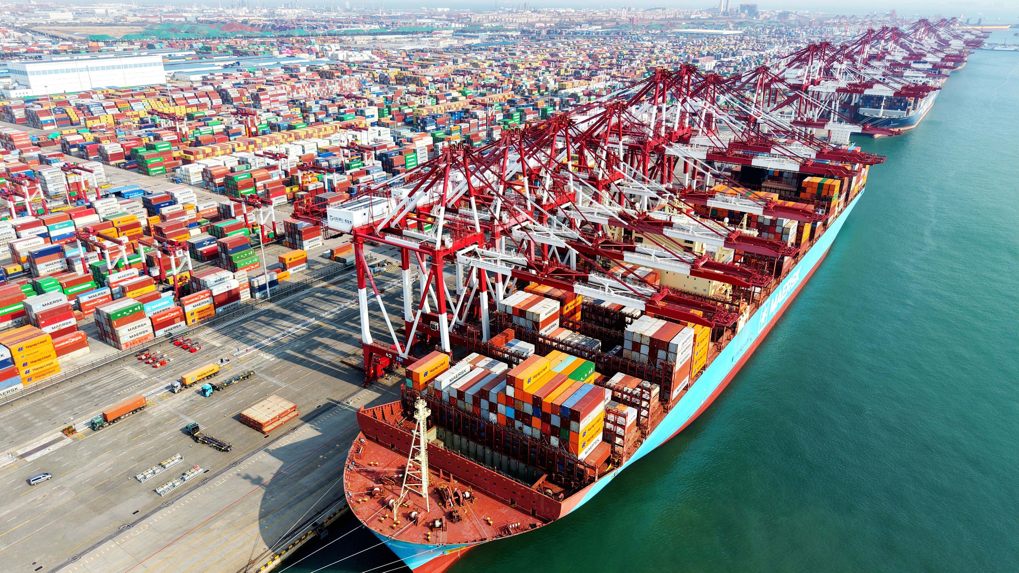 3月10日,在山东港口青岛港,外贸集装箱码头作业一派繁忙(无人机照片)。新华社发(俞方平摄)